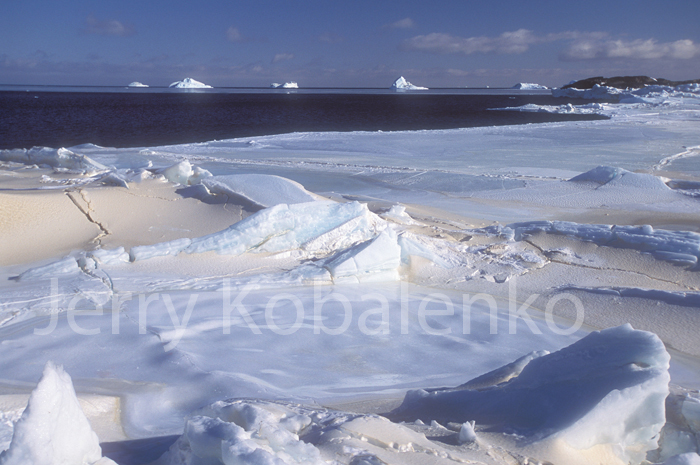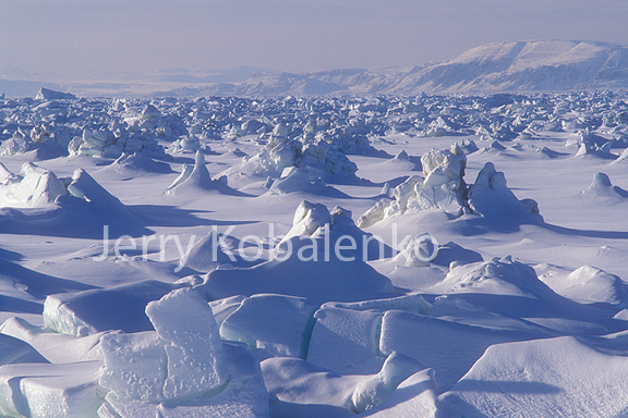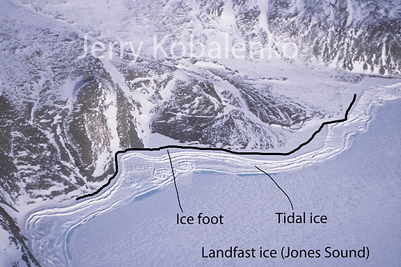 The first image shows an aerial overview of the ice foot on the south coast of Ellesmere Island. The landfast (non-moving) ice is a typical highway for both past explorers and modern travelers. In this first photo, the ice of Jones Sound is smooth, so there is no need to use the ice foot, which lies just behind the barrier of tidal ice. (This tidal ice varies from insignificant to near-impenetrable, depending on local tides and shallowness of the water around shore.) In some places, though, even landfast ice may be so rough that sledding through it is a nightmare. With a heavily loaded sled, the ice in photo 2 allows 100 metres/hour of very difficult travel, if that. If a detour around this obstacle does not exist, you take to the ice foot (photo 3). The ice foot is smooth, continuous, great travel -- but it also slavishly follows the coastline, so it isn't necessarily great if the shore wiggles and indents radically. In photo 3, incidentally, notice the kayak stand from ancient Thule residents to this area.