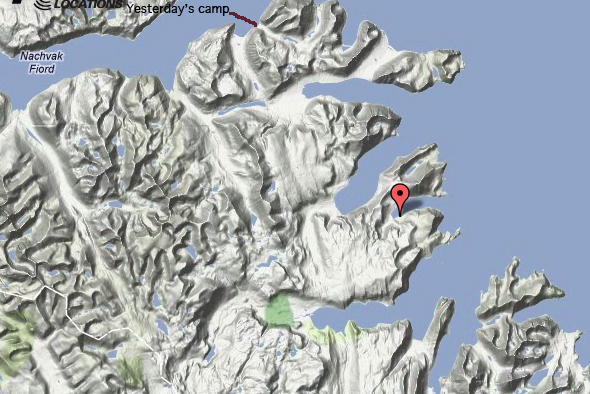 Later...their retreat has begun. Noah's latest position report shows they have paddled south from their last camp at Nachvak Fiord and are now hidden inside Reddick Bight, one of the few landing places in that area. Understandably, they did not paddle an ambitious distance today.