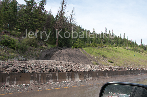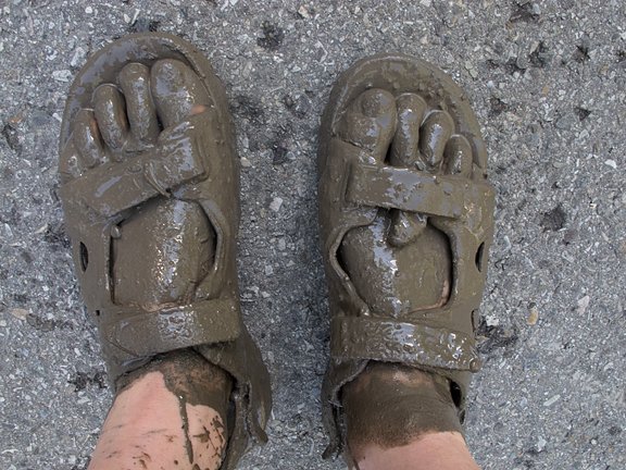 Just back from hiking Mount Robson with a friend. Despite dire weather forecasts, we had sunshine the entire four days. While driving home, we got stuck on the Trans Canada Highway when a mudslide came down near Banff and covered the highway. At first we abandoned the car and started to cycle the rest of the way home via a bike path (Robson park allows mountain biking for the first 7 km, so we had our wheels with us). Even the bike path required wading through a stretch of mud, resulting in well-coated feet. But then we heard that they reopened the eastbound TCH, so back to the car and home. Meanwhile, thigh-high mud and gravel plastered the westbound lanes for several more hours.
