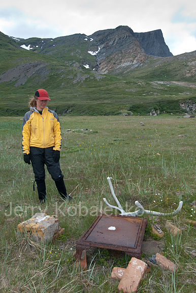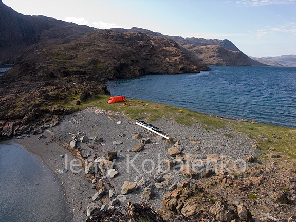 Lost Channel, above, is a narrow neck of land bifurcating what should be a continuous channel. For kayakers, it's more than a liftover, so it makes sense to time your day to camp there. Lots of Paleoeskimo rings to the left of my red tent suggest that earlier peoples did just that. The bank is high enough that a tent isn't washed by waves from either side in a gale. However, polar bears often rest here too, judging from the abundant prints.