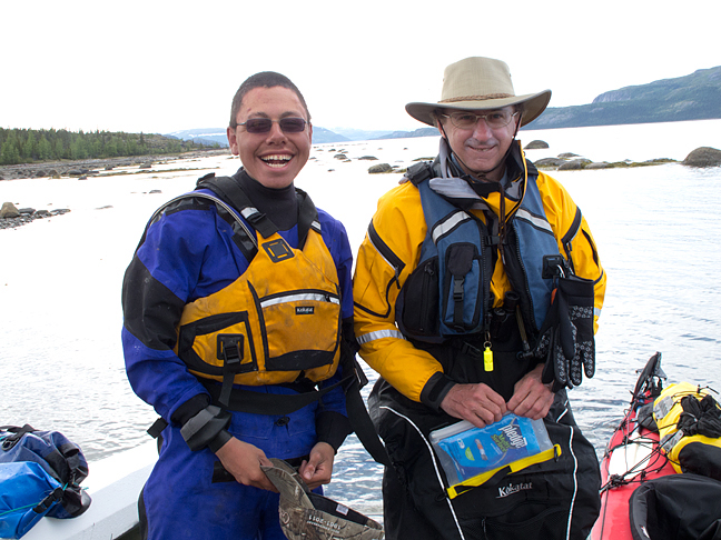 I've already introduced Noah to readers in my reports of the sledding expedition we did together from Nain to Kangiqsualujjuaq this past winter. Lev Tarasov is a physicist who works out of Memorial University in Newfoundland. Looking for a third member, Noah posted a notice on a Newfoundland kayaking site and Lev responded. Rod MacKinnon contacted me some months ago for information on kayaking Labrador, and I passed him on to Noah. Rod has not done a trip of anywhere near this length before, but in subsequent conversations he has always sounded level-headed and well-prepared. As well he might: Rod won the Nobel Prize for chemistry a few years ago, for his work on potassium channels. Now he's working on Labrador channels.