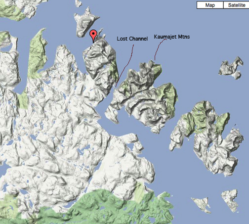 Noah and comrades have just rounded the corner after Lost Channel and are back in relatively sheltered waters after putting the Kaumajet Mountains behind them. The steep-sided fiord north of Lost Channel is usually a wind tunnel, if my two experiences kayaking it allow me to so generalize.