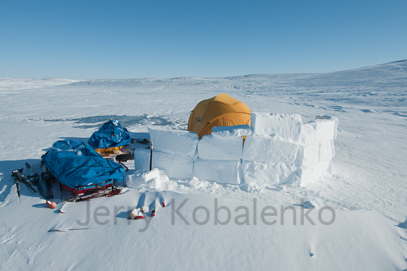 The previous winter, Noah tried to do a long snowshoe trek, pulling his own wooden sled, or komatik, behind him, but had equipment problems and had to abort. His trek was a mixture of modern and traditional, with the emphasis on traditional: He brought a nylon dome tent, but also an Inuit seal oil lamp. This sort of lamp is fine when simmering all day in the snow house, but since it's not pressurized, it takes forever for a traveler to melt enough drinking water on it.