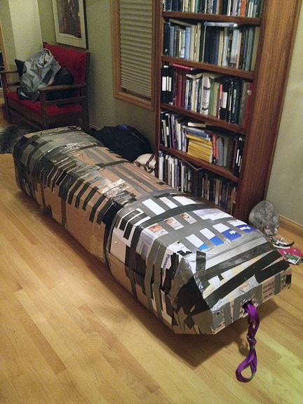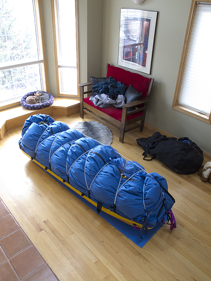 It's always exciting when the great unruly piles of equipment finally coalesce into neat units ready for shipment. In this case, most of the gear is going to Labrador in one great sled load, boxed for protection with cardboard reinforced by several rolls of duct tape. Thanks to Air Labrador and to the Canadian Rangers, a northern branch of military volunteers, for helping transport this enormous load from Calgary to Nain. Shipment of sleds typically costs at least as much as the sleds themselves, so I simply leave the sleds in the north. Some travelers have a girl in every port; I have sleds in every port.