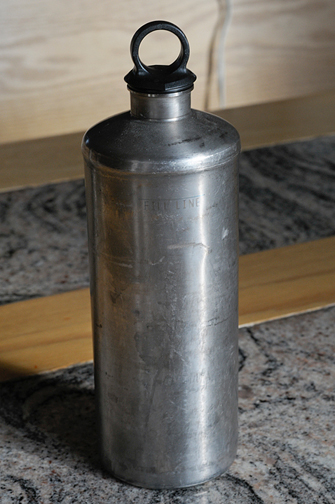 Some years ago, as part of a sponsorship deal, Mountain Safety Research kindly gave me 10 titanium fuel bottles. These bottles, a little less than a quart each in capacity, really are lighter than their aluminum counterparts. Nevertheless, the 10 bottles together save a mere pound in total. I only ever bring four or five of them on an expedition, anyway, because at higher capacities it's just as light to carry the four-liter can that the white gas comes in.