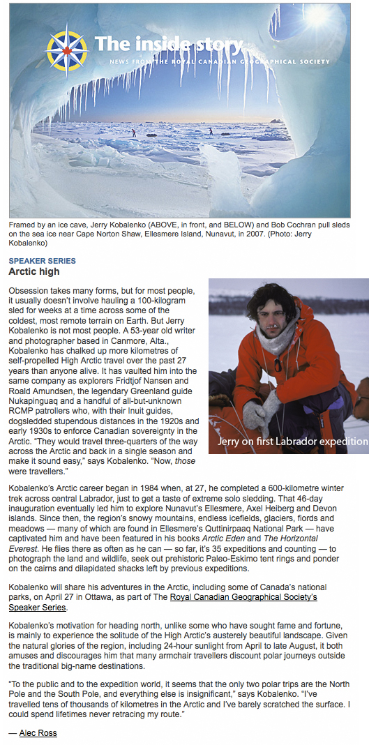 Back to WRITING December 31 At this year's Banff Mountain Book Festival, one of the highlights was an interview with Dervla Murphy, the Irish travel writer who cycled from Britain to India in 1963. A wise, independent spirit at a time many Western women were in Betty Crocker mode, she wrote the book Full Tilt about her adventure. It's out of print in North America, so I ordered a copy from England. Although she's written lots of other books, I was especially interested in this one, which she apparently compiled directly from her journal notes. I keep lots of notes during my travels -- I average about an hour writing a day, which is not always easy at the end of 8 or 12 hours of sledding or kayaking or whatever. I use the notes as reminders and draw on the occasional one-liners or insights, but I never lean on the notes too heavily. If I transcribe huge passages, even good ones, verbatim, the narrative loses its flow. But Murphy's notes were so good and well-structured that they could stand alone, preserving the immediacy of the experience while still having a literary shape. As with all good travelers, her spirit shows through best during the worst experiences. A couple of early attempted rapes read almost humorously: "As my adversary was armed with a revolver I kept my gun in my pocket and used unprintable tactics to reduce him to a state of temporary agony." Then she bolted, taking his pants with her. November 30 Pure joy is one of the rarest of all emotions, yet I've experienced it several times traveling in the Arctic. I suppose it's the combination of a physical life and the place's overpowering beauty. Joy transports you to a different place. You never forget the times it washes over you. Joy is so rare, fleeting and intense that it is very difficult to convey; I know of only two successful expressions of it in art: the Ode to Joy passage in Beethoven's 9th Symphony and Arthur Rimbaud's prose poem, Morning of Drunkenness. If there are others, I wish someone would point me to them. November 26 Was looking over a travel magazine today and noted an article about a winter adventure that began something like,' "Look out, Mike," said Johan. "It's coming our way." ' This unsuccessful entree to a piece made me recall a wise bit of writing advice from an old editor of mine, the late Teddi Brown: "Quote leads went out with hoop skirts." November 9 Once in a while, it's fun to look at the countries that spend time on this site and wonder what on earth they're finding here. Today, example. Greenland, sure. But Iran? Israel? Amusing to consider that the few minutes they spend here may be one of the positive things they have in common. Deep down, we're all polar. October 28 For those who think digital rights make book and photo royalties complicated, get a load of the byzantine nature of the new music business in this Rolling Stone story. October 24 Journalists love an anniversary. It's the simplest sort of hook. A hook is what editors ask for when you propose a story. It's supposed to answer the question, "Why do this piece now?" If something happened any nice round number of years ago -- 10, 25, 75, 150 -- it's an excuse for a story. If Lincoln was born 200 years ago today, then write about Honest Abe. Expeditioners do the same thing, trying to drum up interest by timing their project with the anniversary of a famous precedent. This year, it's the centenary of Amundsen and Scott's race to the South Pole, and many expeditions are doing the obligatory "In the Footsteps of". It'll be almost busy down there. One of my failings as a journalist is that I've never been big on anniversaries. Maybe it's my background in mathematics. Our number system happens to use base 10, but there is nothing intrinsically more significant about 10 or 100 than, say, 14 or 37. A hook has its uses. It leaves the reader with something meaty and succinct to take away at the end of a piece. It's like the moral at the end of an Aesop's fable. But the question, "Why do this piece now?" has always made me uncomfortable, because my real answer is often, "Because it's a fascinating topic that hasn't been done before." In this case, however, the truth doesn't win any assignments, so I make my pitch armed with a hook. Anniversaries excluded. September 14 One of my favorite quotes comes from Rebecca Solnit's classic book about walking, Wanderlust. Although I didn't use it as a heading quote on either of my books -- it's not a writer's job to interpret his own stuff -- it's one of those lines I identify with. Speaking of John Muir's Thousand Mile Walk to the Gulf, Solnit wrote: "[It] is episodic, as are most such walking books. In such travel literature there is no overarching plot, except for the obvious one of getting from point A to point B…In a sense these books on walks for their own sakes are the literature of paradise, the story of what can happen when nothing profound is wrong.” September 12 A recent article on China's interest in the Arctic includes a shot of a polar bear on the sea ice against some icy mountains. Although it's hard to judge from so small a photo, the relative size of the bear and the mountains suggests to me that one of them has been Photoshopped in. It reminded me of the first polar bear "sandwich" in the history of photography. In 1869, artist William Bradford went on a cruise to Greenland with two Boston studio photographers, who were there to take reference shots for him. Bradford's The Arctic Regions became the first arctic photo book. This beautiful work includes one shot of some polar bears that have clearly been stripped into the scene in the darkroom. The deception is obvious in the full-sized image, which I've seen. Over a century before Photoshop, photographers were manipulating reality and not admitting it. September 1 A sobering piece on the future of being a professional writer in the digital age. July 3 Today's Globe and Mail has a slideshow of my arctic imagery. An accompanying editor