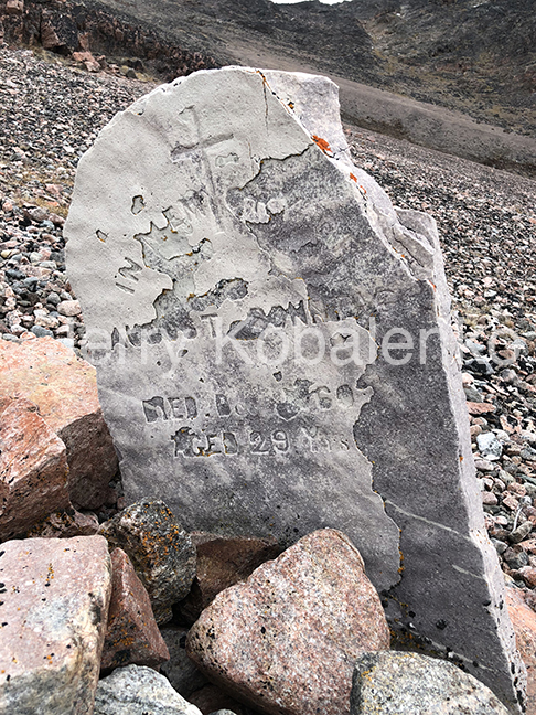 The grave of Sonntag, though smaller and subtle, lay hidden in a little cove at the mouth of Foulke Fiord, and was even more thrilling. It looked like the headstone had been upholstered in a thin coat of plaster, and the inscription carefully etched in. I had never seen so old an exploration artifact before: Nothing on the Ellesmere side dates back that far, since the first known Europeans to land on Ellesmere were members of George Nares' expedition in 1875. A couple of additional unmarked graves of similar vintage stood beside it.