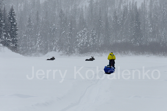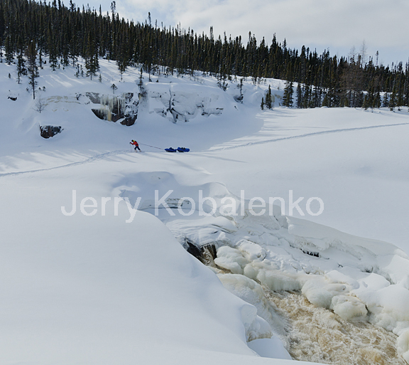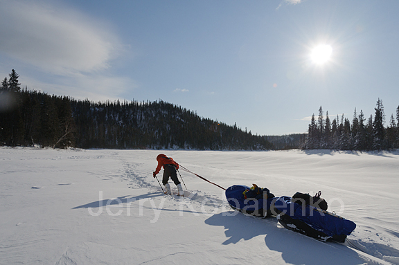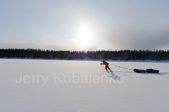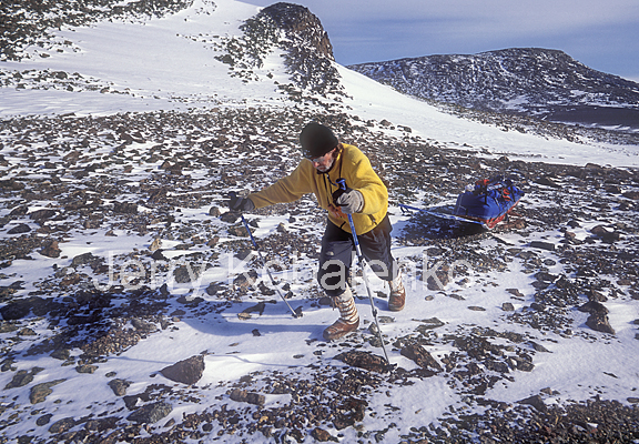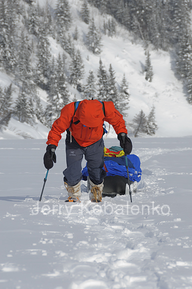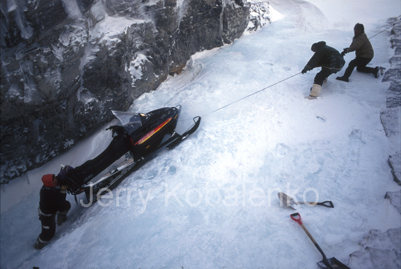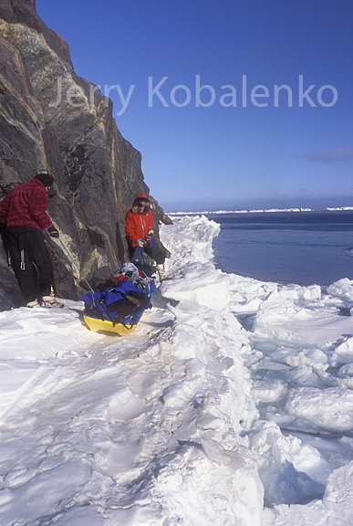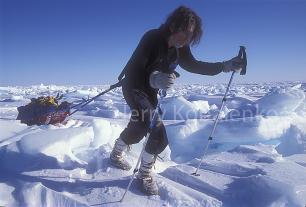 Bob Cochran has taken off his skis to maneuver more efficiently. Depending on the weight of the sled, lifting over a large piece of ice can be extremely difficult. Beginning sledders make the mistake of trying to do the lifting with their legs. This burns you out prematurely. The trick is to lean forward, legs locked, and let your body weight do the lifting. With practice, you can do this without breaking stride.