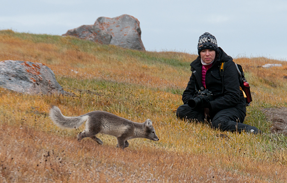 More commonly, wildlife encounters require luck. One summer, we passed near a tolerant bearded seal, below, along the coast of Baffin Island. On another occasion, an arctic fox at Etah, Greenland wasn't bothered by people at all. Such encounters are more gifts than givens.