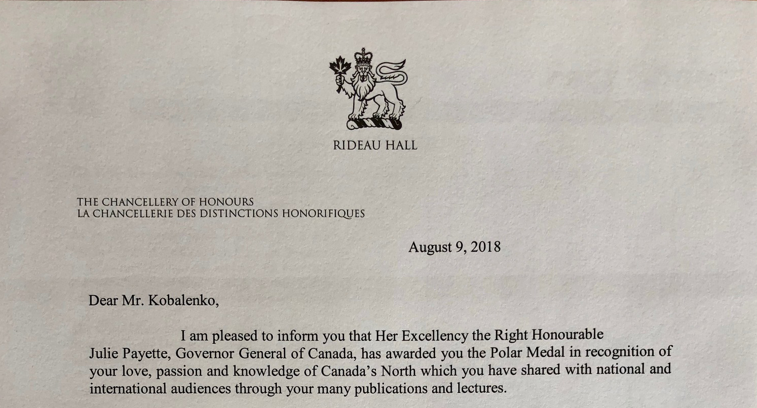 On Saturday, I'm in Regina to receive the Polar Medal from the Governor General. It's part of the series of Canadian Honours, like the Order of Canada. I like to think of it as an Order of Canada for arctic types.