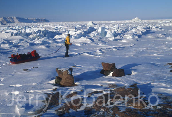 This is the same general area as the eastern Ellesmere Island photo, but much worse. This image, looking west into Smith Bay, was taken with a 200m or 300mm telephoto lens, so the pieces look much closer together than they really are. However, the ice field is dense enough that no amount of twisting and turning can prevent you having to occasionally haul the loaded sled over a block of ice, as in the image directly below.