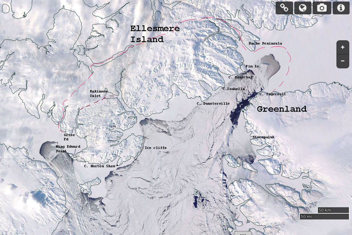 Brother John Glacier, named by Elisha Kent Kane in 1855, and two broken-down hunting cabins at the head of Foulke Fiord, sometimes called Etah by modern visitors.