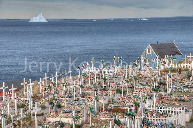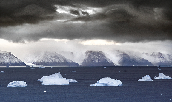 A Greenland fiord, choked with iceberg bits.