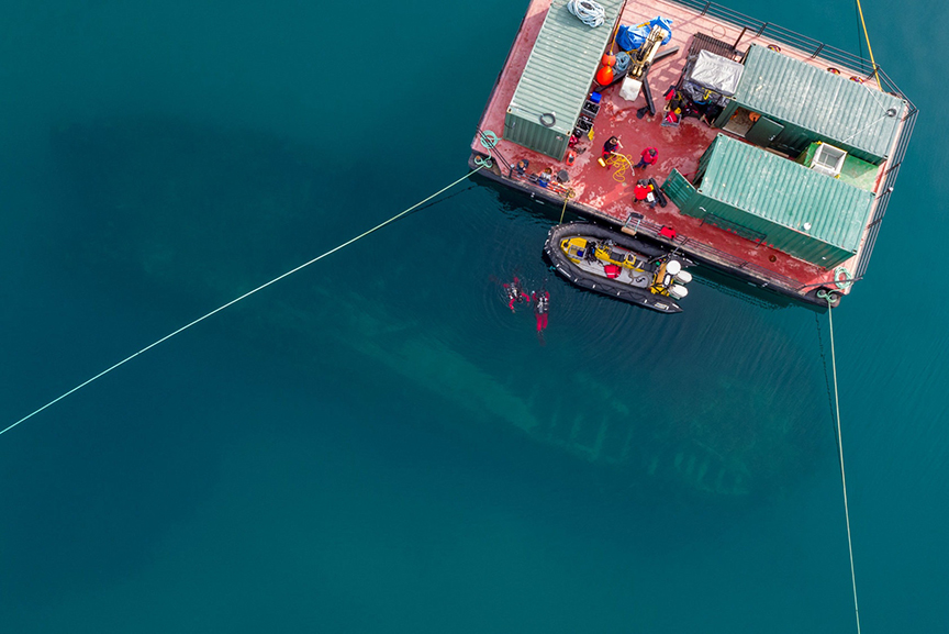 View of the sunken Erebus looming below the archaeologists' diving platform. Parks Canada photo