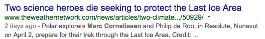 This year, a couple of expeditions managed to get to the starting point at Ward Hunt Island on northern Ellesmere. One of the expeditions, clearly well-funded, had access to its own plane and pilot. Neither lasted long. Ironically, early March, when the sun has just returned, is often the coldest time of year -- colder even than the polar night. In -57C (-70F), the well-funded guy frostbit his fingers while dealing with a fuel leak in his stove. He and his partner were evacuated after just two days. The piggybacking expedition, consisting of a solo guy and his dog and sponsored mainly by a regional car mechanic shop, unsurprisingly flew home at the same time.
