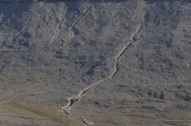 So instead, we focused on the eastern Arctic, and eventually reached our farthest north at Foulke Fiord, site of the old Inuit hunting camp of Etah. In the late 19th and early 20th centuries, many arctic expeditions passed through or based themselves at Etah. Our cruise ship, the Ocean Endeavour, often stops here: the head of the fiord is a good place to hike, and muskox are common on the grassy side slopes. Although there are a couple of broken-down hunting cabins of contemporary vintage here, the traditional community of Etah is not in this location at the head of the fiord, but several kilometres away, on the north side.