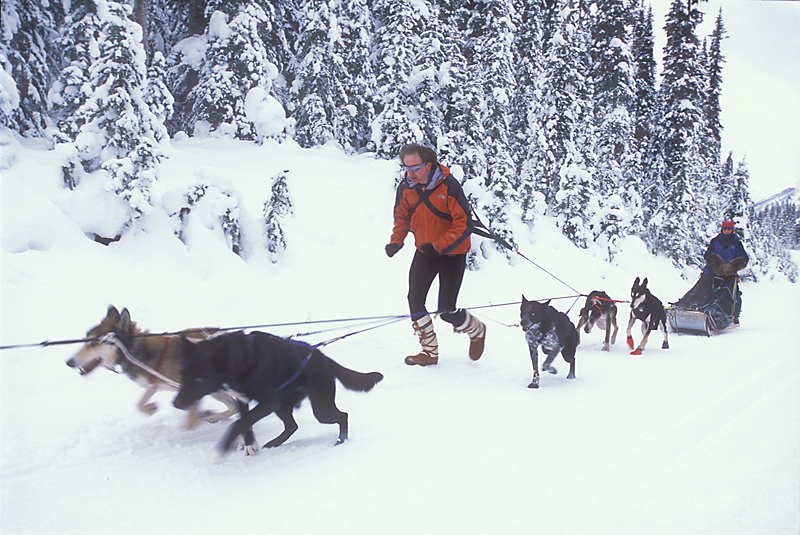 I once tried a similar sled-training gimmick, joining a team of sled dogs hauling tourists in Banff National Park, below. It was just done for the photo. I've never trained specifically for manhauling, though I do workouts that push the core, triceps, lats and the small of the back: the areas that sledding specifically taxes.