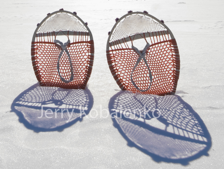 Bern Crawford repairing a traditional pair of caribou babiche snowshoes. Below, a pair of his custom-built snowshoes.